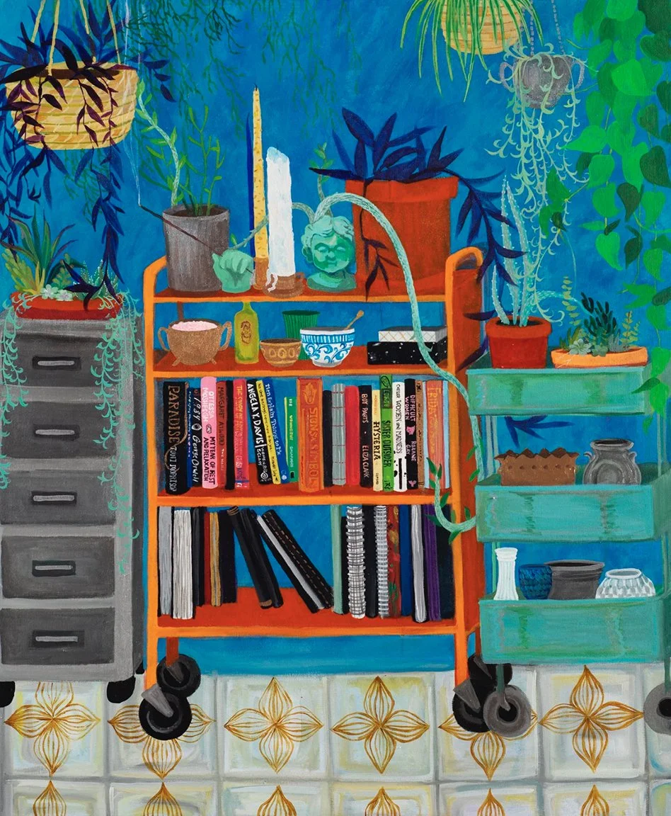 Our contemporary world is so frenetic there is no room for stillness. There is a constant and constantly bombastic inundation of chaos- a full marching parade going on in your head at all times. Yet, when we find time for a quiet moment, there is so much to be gained in it. These paintings are my forced quiet moments. In gathering, composing, and representing each point of reference from iconography in the wallpaper to book titles, I am having a conversation with myself, spending time in rumination. I make these paintings as a centering ritual to gather my thoughts on various concerns (class, justice, feminism, social anxiety, the forgotten, systems of hierarchy and power, art history, history writ large, systems of care and support). I hope that the resulting imagery creates a sanctuary space for the viewer for their own reflections in stillness, perhaps informed and prompted by my intentions and the symbolism embedded in the work, perhaps loaded with their own histories and associations.