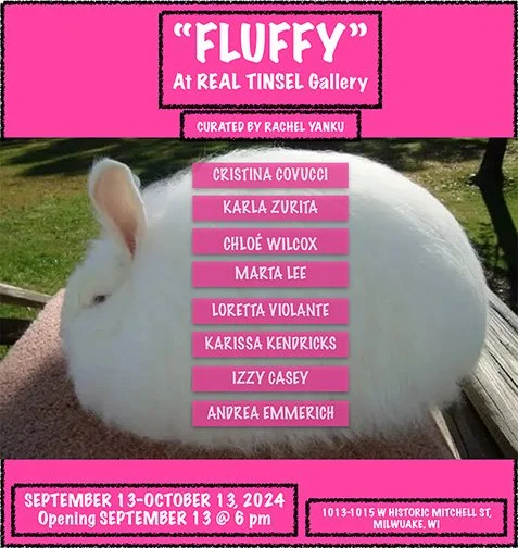 Angora rabbit is the fluffiest bunny in the world. When you see it you may have an instinct to act with “cute aggression” towards it (i.e pinch, squeeze, or bite). Real Tinsel is pleased to present, “FLUFFY”, a group show curated by Rachel Yanku. Over the past year Yanku has acquainted herself with a group of artists who work primarily in painting and sculpture. Cristina Covucci, Karla Zurita, Chloe Wilcox, Marta Lee, Loretta Violante, Karissa Kendricks, Izzy Casey, Andrea Emmerich and began to see a recurring theme in their works: animals. Animals with certain characteristics.